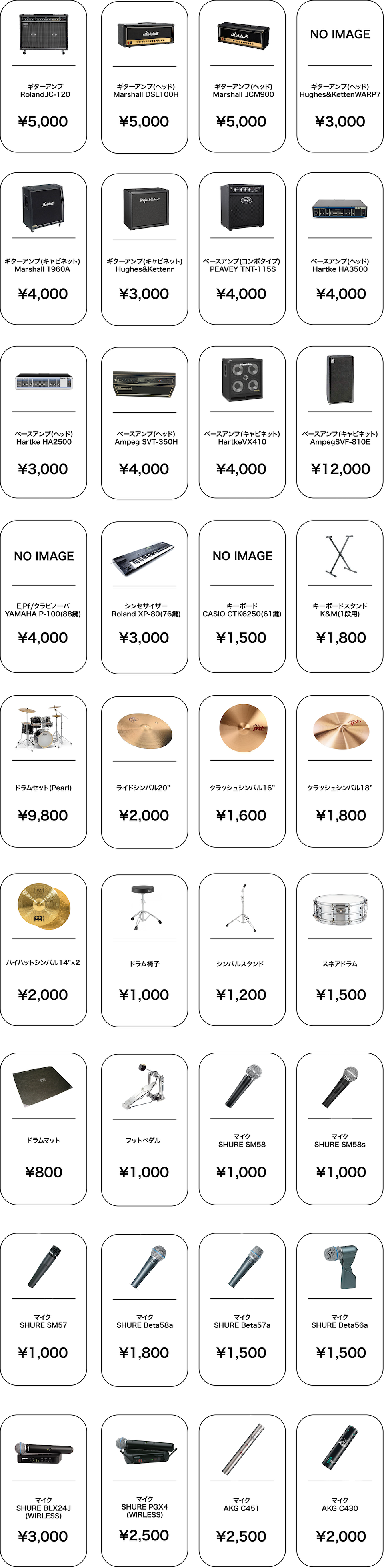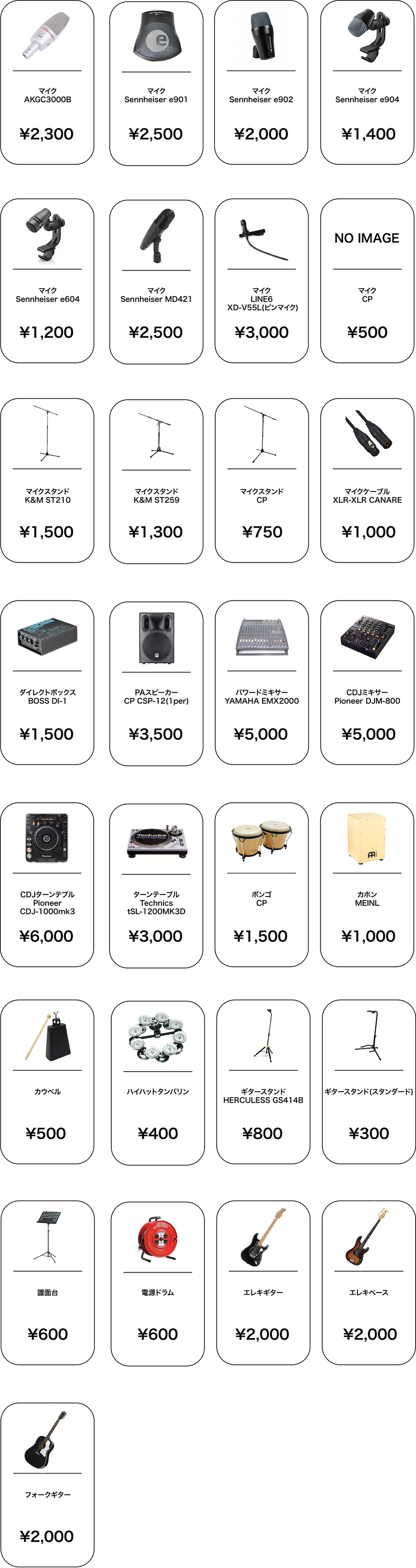 レンタル機材個別価格表(別+消費税)